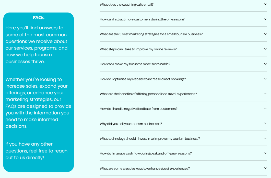 See sample faq on website here: FAQs - Tourism Growth Coach and FAQs - Sarah Colgate